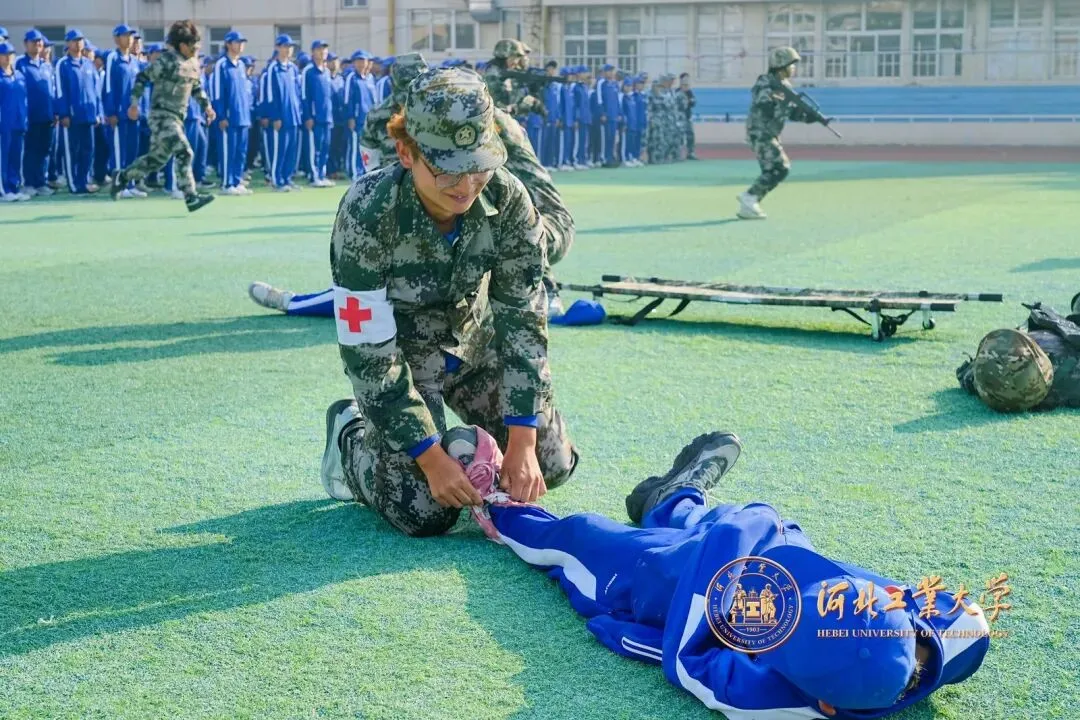 救护人员反应迅速、操作规范,熟练完成伤员转移、急救处理等流程,既体现了军训的实战化特色,也展现了学生与教官们的应急处置与协同配合能力。