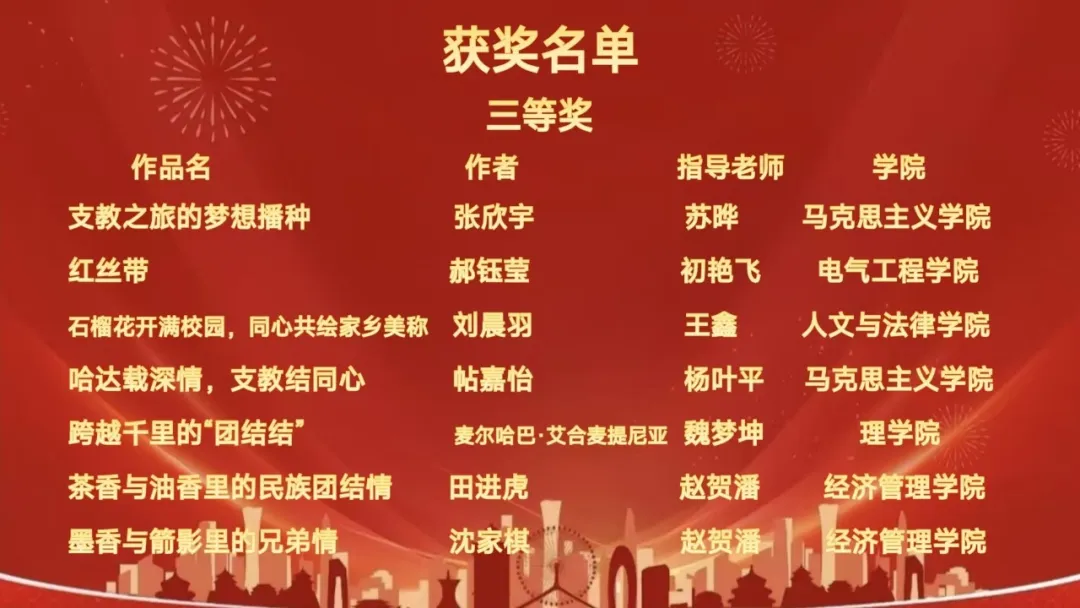 此次征文大赛涌现出一批扎根生活、饱含深情的优秀作品。从材料科学与工程学院、理学院等不同学院师生的笔端,我们既能读到“天山燕赵一家亲”的民族交融情,也能感受到“心中敕勒川,最美同心圆”的文化共鸣;既见证着校园里各民族学子“共绘团结画卷”的青春实践,也触摸到“同心共筑中国梦”的信念力量。这些作品不仅是师生对“身边民族团结”的生动记录,更是学校深化民族团结进步教育、推动铸牢中华民族共同体意识的鲜活成果,为新时代民族团结事业书写了生动的青春注脚。